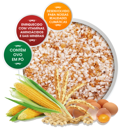 Para equilíbrio da flora intestinal dos pássaros. Um produto formulado para aves no início de suas vidas, sendo excelente para o seu perfeito desenvolvimento. O alimento é completo, uma Farinhada seca, isenta de pigmentação, feita com milho branco, ovo em pó, e enriquecida com elementos vitais para os pássaros. Indicado para Canários, Manons, Mandarins, Curiós, Bicudos, Canários da Terra e demais Granívoros.
