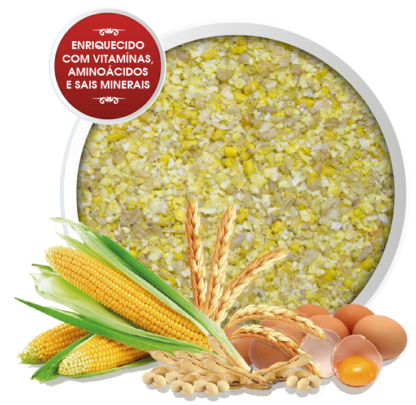 Milho*, Aveia Floculada, Soja Integral Extrusada**, Farelo de Soja**, Óleo de Soja Refinado**, Aromatizante, Fosfato Bicálcico, Calcário Calcítico, Cloreto de Sódio (Sal Comum), Sulfato Ferroso, Sulfato de Cobre, Sulfato de Manganês, Óxido de Zinco, Iodato de Cálcio, Selenito de Sódio, Vitamina A, Vitamina D, Vitamina E, Menadiona Bisulfito de Sódio, Tiamina (Vitamina B1), Riboflavina (Vitamina B2), Piridoxina (Vitamina B6), Vitamina B12, Niacina, Pantotenato de Cálcio, Ácido Fólico, Biotina e DL-Metionina.
