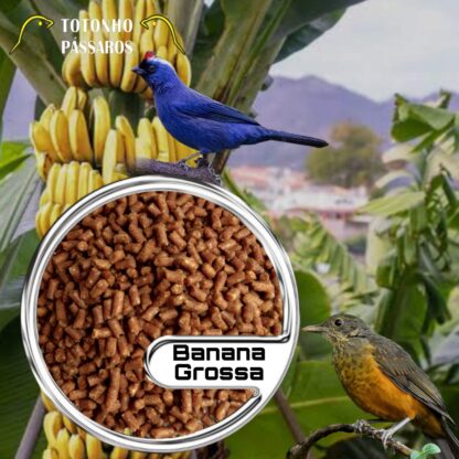 Alimento completo e balanceado com todos os nutrientes que a ave necessita. Os peletes são produzidos com matérias primas de qualidade, sempre limpas. A ração de banana é muito adoradas pelos Frades e Sabiás.