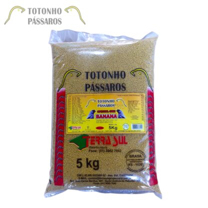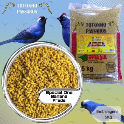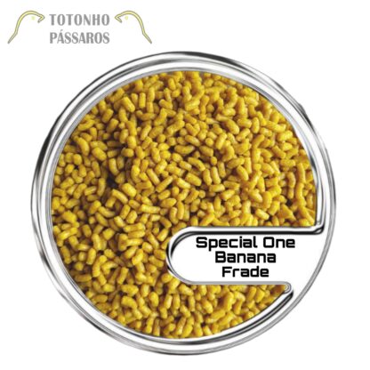 Composição: Ração Extrusada (Quirera de Arroz, Farelo de Soja, Proteína Texturizada de Soja, Óleo de Soja, Ovo em Pó, Cloreto de Sódio, Cálcio, Probióticos, Essência aromática sabor Banana, Corante Alimentício, Premix Completo para Aves, Aminoácidos, Minerais, elementos anti-fúngicos e anti-toxinas), milho, ervilha, aveia, frutas e amendoim.