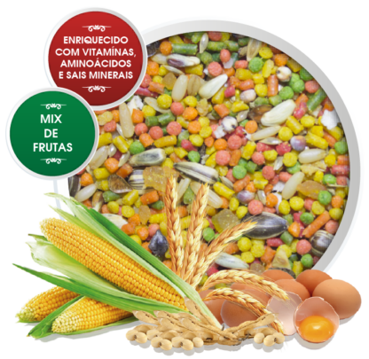 Frutas Desidratadas, Milho Laminado*, Farelo de Soja**, Soja Integral Extrusada**, DL-Metionina, Farelo de Arroz Intergral, Sorgo de Grãos, Aveia Descascada, Óleo de Soja Refinado**, Semente de Girassol, Grãos de Alpiste, Aromatizante, Fosfato Bicalcico, Calcário Calcítico, Sal Comum (Cloreto de Sódio), Sulfato Ferroso, Sulfato de Cobre, Sulfato de Manganês, Óxido de Zinco, Iodato de Cálcio, Selenito de Sódio, Vitamina A, Vitamina D, Vitamina E, Menadiona Bisulfito de Sódio, Tiamina (Vitamina B1), Riboflavina (Vitamina B2), Piridoxina (Vitamina B6), Vitamina B12, Niacina, Pantotenato de Cálcio, Ácido Fólico e Biotina.